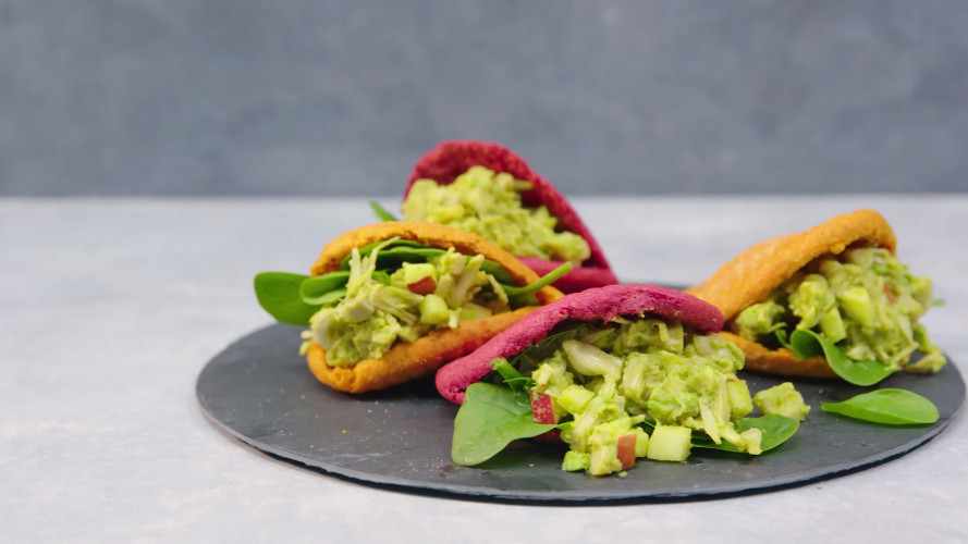 - Voeg de appel, geprakte avocado en vega-mayonaise toe aan de Jackfruit;